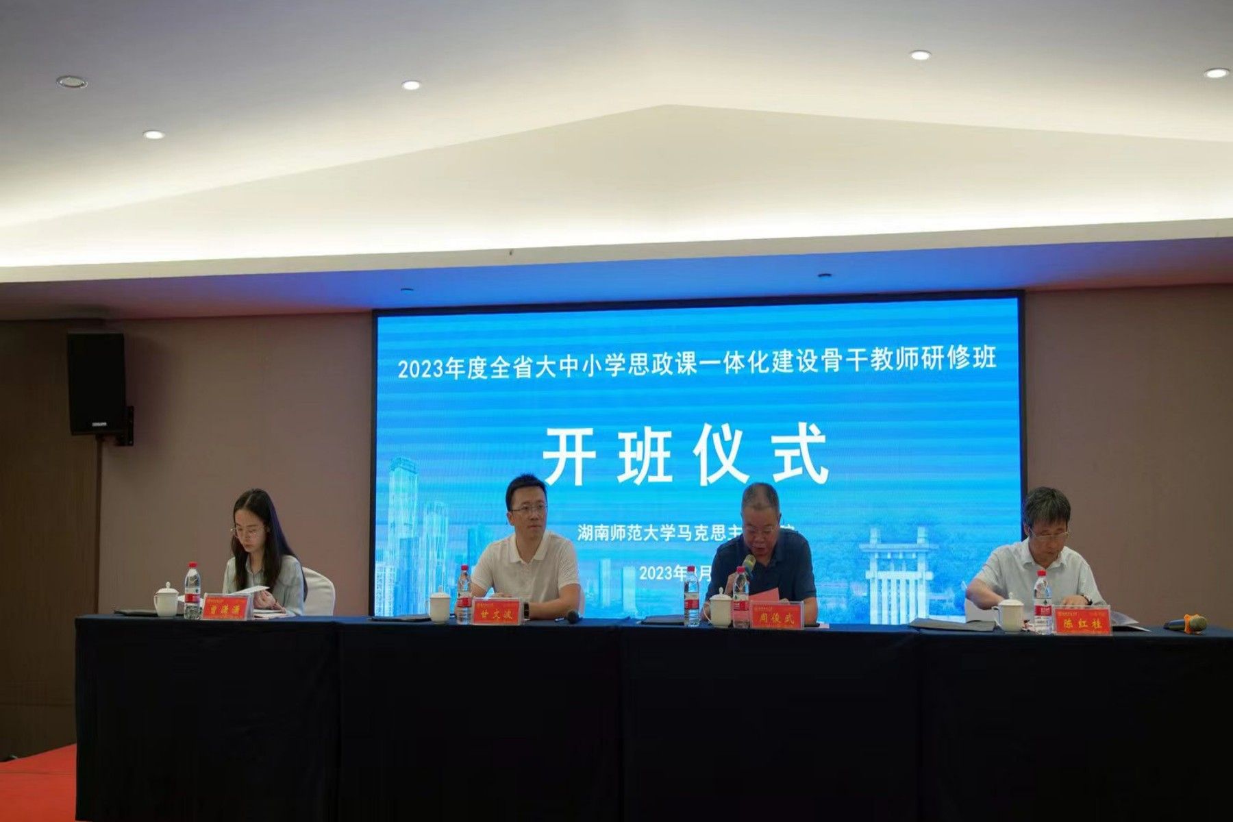(供稿 馬克思主義學院)8月25日,由湖南省教育廳主辦、湖南師范大學承辦的2023年度湖南省大中小學思政課一體化建設骨干教師研修班順利舉行。省委教育工委宣傳部部長、省教育廳思政處處長甘文波,我校黨委副書記周俊武出席開班儀式。開班儀式由馬克思主義學院黨委書記陳紅桂主持。