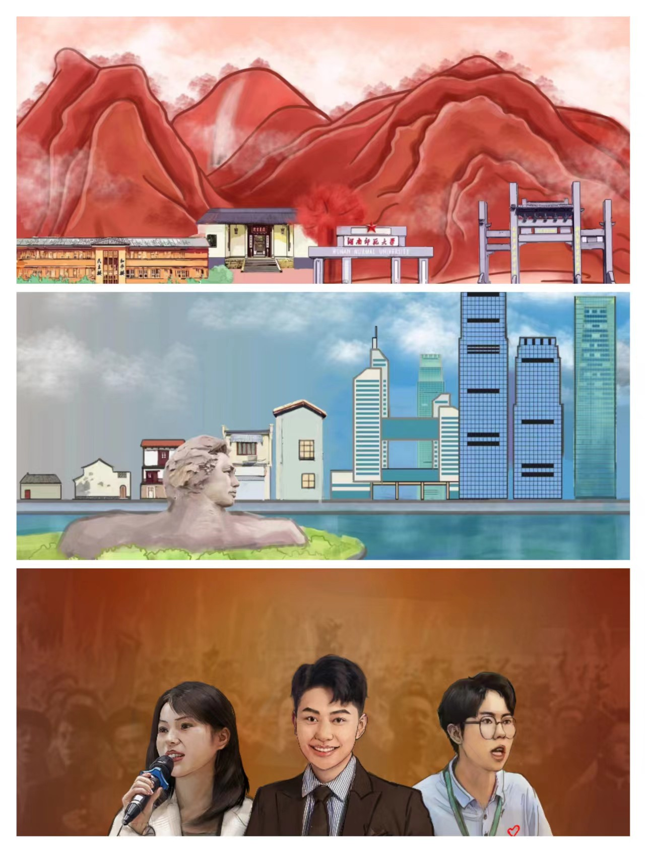 湖南師范大學(xué)美術(shù)學(xué)院學(xué)生秦念志則闡述了《“萬山紅遍”:湖南怎么這么紅?》《“百舸爭流”:湘江怎么這么潮?》《“同學(xué)少年”:青年怎么這么牛?》三幅美術(shù)學(xué)院學(xué)生作品的創(chuàng)作意圖,這三幅作品分別呈現(xiàn)了岳麓山下從救國事業(yè)到強(qiáng)國事業(yè)的發(fā)展,橘子洲頭的青年毛澤東像見證著改革開放新成就,以及中南大學(xué)和湖南師范大學(xué)三位“全國自強(qiáng)之星”背后站著的還是無數(shù)革命先驅(qū)身影三幅景象,實(shí)現(xiàn)了繪畫藝術(shù)與思政教育的完美融合。