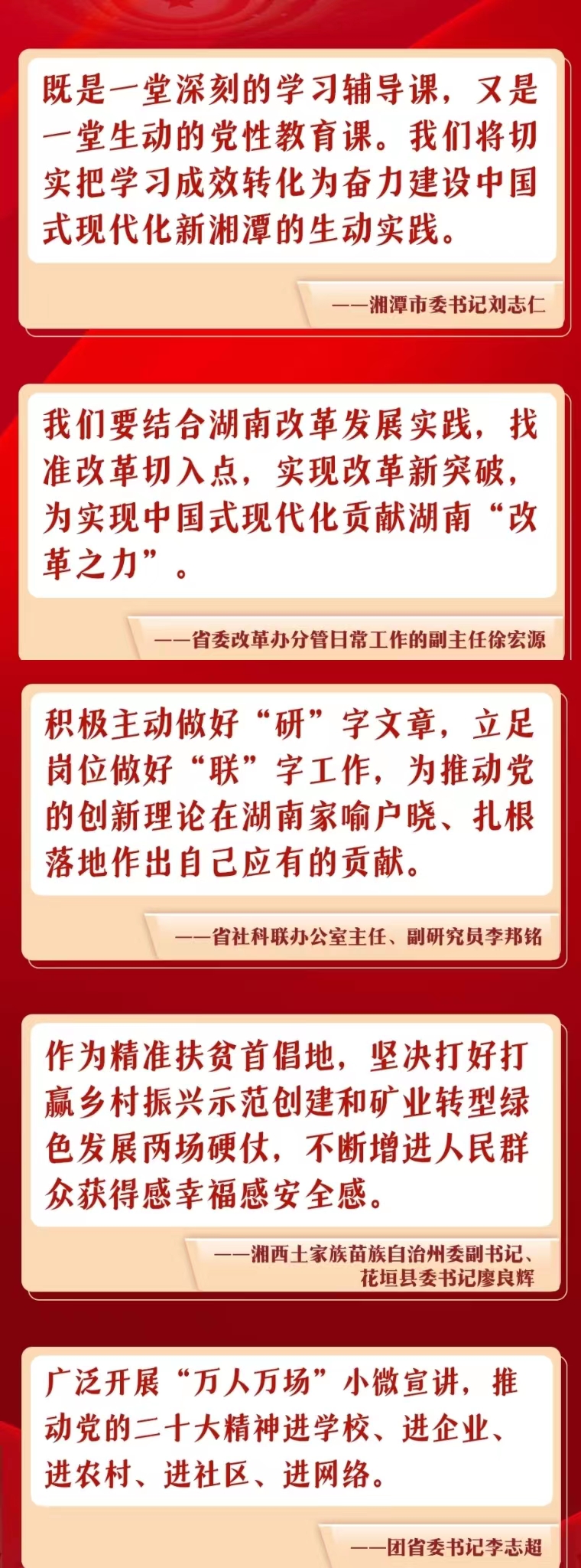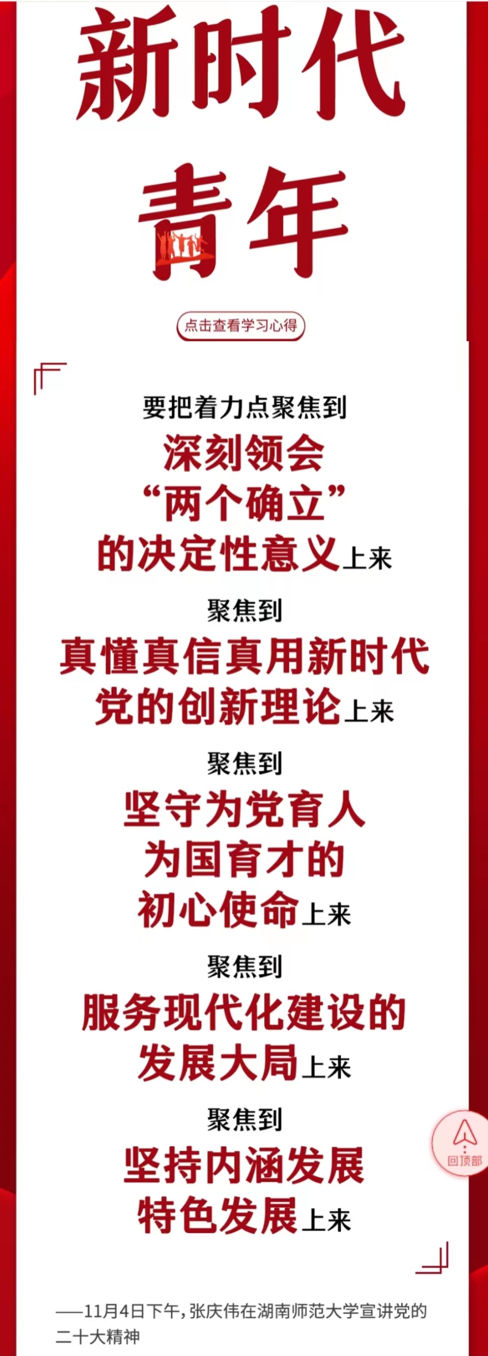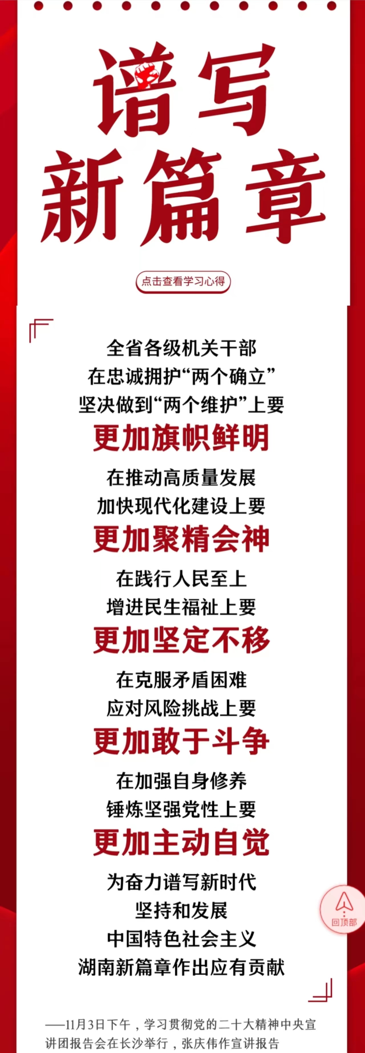 11月3日-9日,中央宣講團(tuán)成員、湖南省委書(shū)記、省人大常委會(huì)主任張慶偉開(kāi)展五場(chǎng)宣講活動(dòng),宣講黨的二十大精神。一場(chǎng)面向全省黨員干部,四場(chǎng)面向高校、企業(yè)、社區(qū)和鄉(xiāng)村。二十大精神怎么學(xué)?省委書(shū)記為你劃重點(diǎn)。下一步怎么干?來(lái)看看大家的學(xué)習(xí)心得。