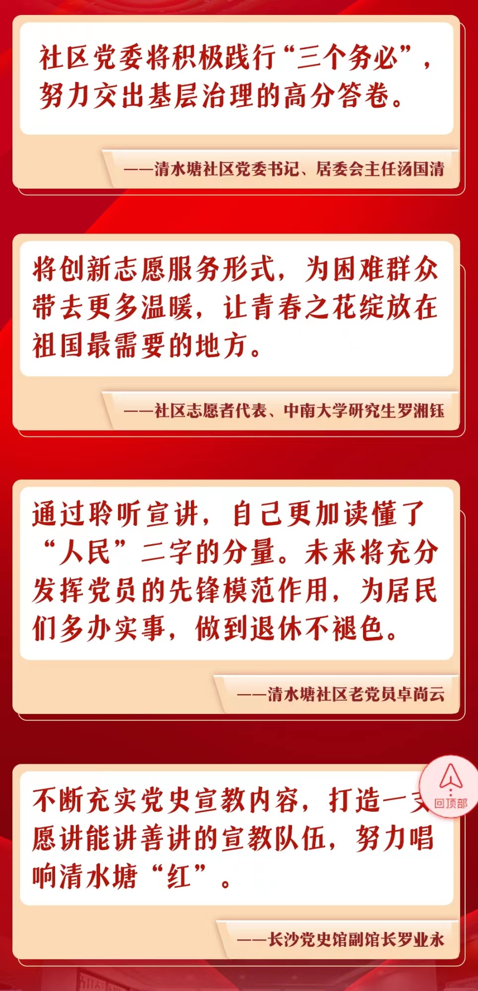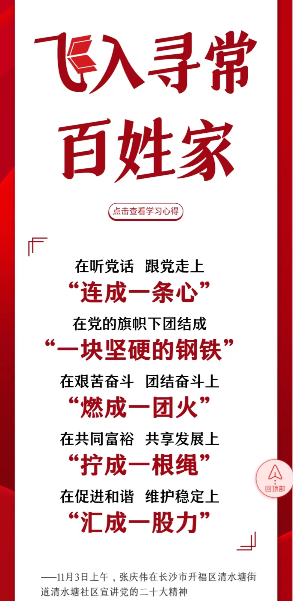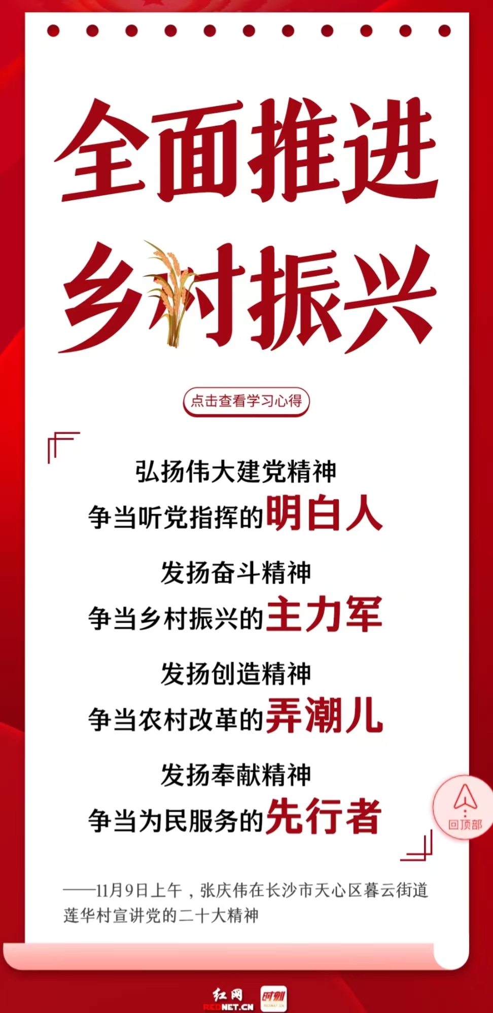 11月3日-9日,中央宣講團(tuán)成員、湖南省委書(shū)記、省人大常委會(huì)主任張慶偉開(kāi)展五場(chǎng)宣講活動(dòng),宣講黨的二十大精神。一場(chǎng)面向全省黨員干部,四場(chǎng)面向高校、企業(yè)、社區(qū)和鄉(xiāng)村。二十大精神怎么學(xué)?省委書(shū)記為你劃重點(diǎn)。下一步怎么干?來(lái)看看大家的學(xué)習(xí)心得。