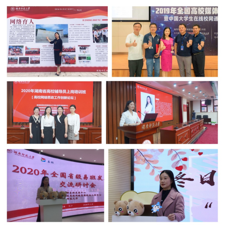 此外,她撰寫了5萬余字的面向思想政治教育工作者和大學生的講座講義《 一“星”一“易”照亮學子前行的方向》《構建新時代社會主義核心價值觀“六微六陣地”傳播教育體系》,10萬余字的課程講義《毛澤東思想和中國特色社會主義理論概論》,先后受邀在高校、二級學院、湖南省輔導員培訓班、湖南省高校網絡思政工作中心研討會上等進行宣講。她撰寫的網絡思政教育工作網文、工作案例多次在《思想理論教育導刊》、全國高校思政教育網、中大在線、高校輔導員微信公眾號等平臺轉發推廣,并連續三屆在教育部“全國高校網絡宣傳思想教育優秀作品推選展示活動”中獲得了優秀案例一等獎和2個優秀案例二等獎。