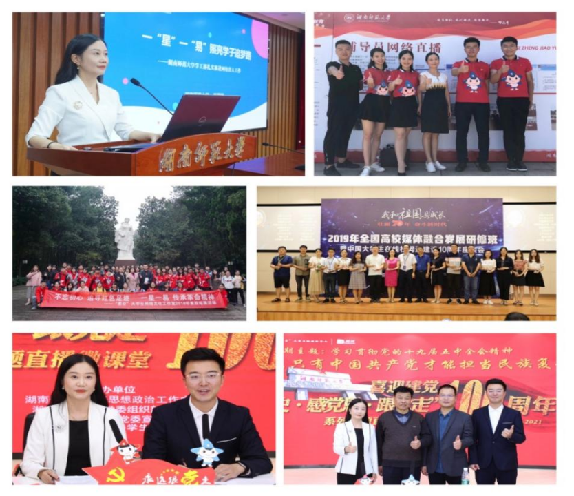 依托于湖南高校網絡思政教育工作中心、學校學生工作部工作平臺等,陳麗榮帶領團隊打造了“一星一易一中”三個平臺,開展了系列的活動。陳麗榮指導40多人的網紅輔導員隊伍,策劃組織了“打call十九大 點贊新時代”等系列網絡直播宣講活動,通過新媒體直播方式讓“學習十九大”更貼近學生,迎合學生喜好,貼近學生需求。此外,她和她的團隊策劃導演了“學習新思想 點贊新時代”系列輔導員宣講直播10余期、“學四史 感黨恩 跟黨走”喜迎建黨100周年系列直播微課堂3期,讓網絡思政教育的覆蓋面更廣。活動讓思政教育的網絡課堂觀看人數達60萬余人次,被新華社、人民網、紅網、湖南教育電視臺紛紛報道。她指導的“星空”獲批成為教育部首批大學生網絡文化工作室,星網成為全國十佳通訊站、十佳思政教育類網站,小星成為全國名站名欄,學校易班工作站成為湖南省優秀易班工作單位......