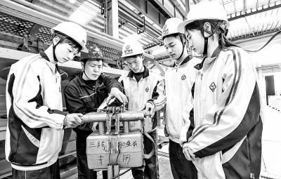 4月3日,浙江物產(chǎn)中大線纜有限公司生產(chǎn)車間,湖州市技師學院學生在學習銅線焊接技術。王樹成攝/光明圖片
