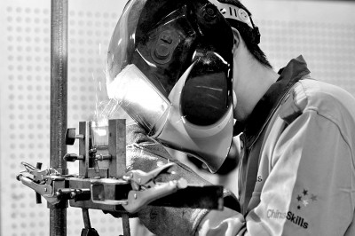 2月10日,安徽省合肥市肥東縣中專學校的鈑金電焊實訓室,學生進行氣保焊操作實訓。阮雪楓攝/光明圖片