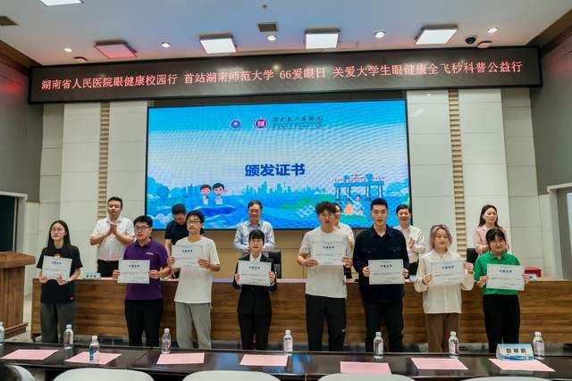 湖南省人民醫院黨委委員朱華波等為遴選出的8名大學生近視防控宣講團成員頒發公益證書。化學化工學院2021級本科生姚瑞帶頭宣誓:作為近視防控“新”力量,將滿懷熱情地把自己學到的護眼知識,傳遞給身邊的同學和家長,助力中國“視覺健康”!