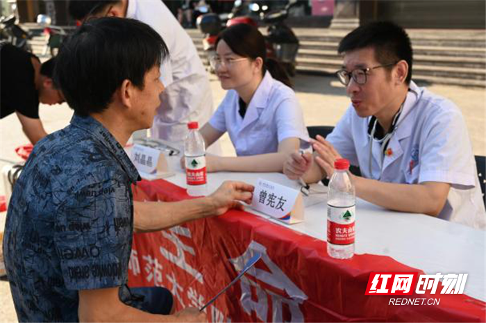 活動期間,湖南師大醫學院師生和湖南航天醫院專家教授為當地群眾進行免費義診活動,宣傳普及健康常識和健康預防知識,并現場指導群眾自助測血糖、量血壓,提升群眾通識健康預防技能。