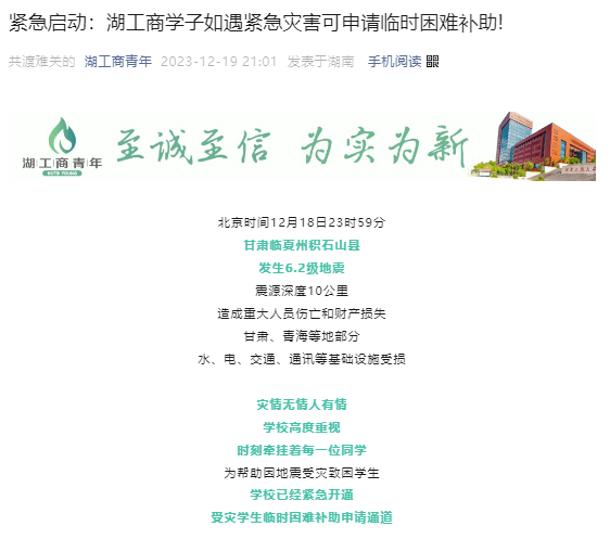 12月18日23時59分,甘肅臨夏州積石山縣發生6.2級地震,造成重大人員傷亡;12月19日09時46分,新疆克孜勒蘇州阿圖什市發生5.5級地震。突發災情牽動人心,湖南多所高校也發布緊急通知,為受災地區學生提供臨時困難補貼!