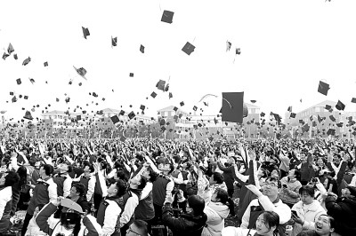 河南省焦作市溫縣一中高三學生們在成人禮上把“成人帽”拋向空中。徐宏星攝/光明圖片