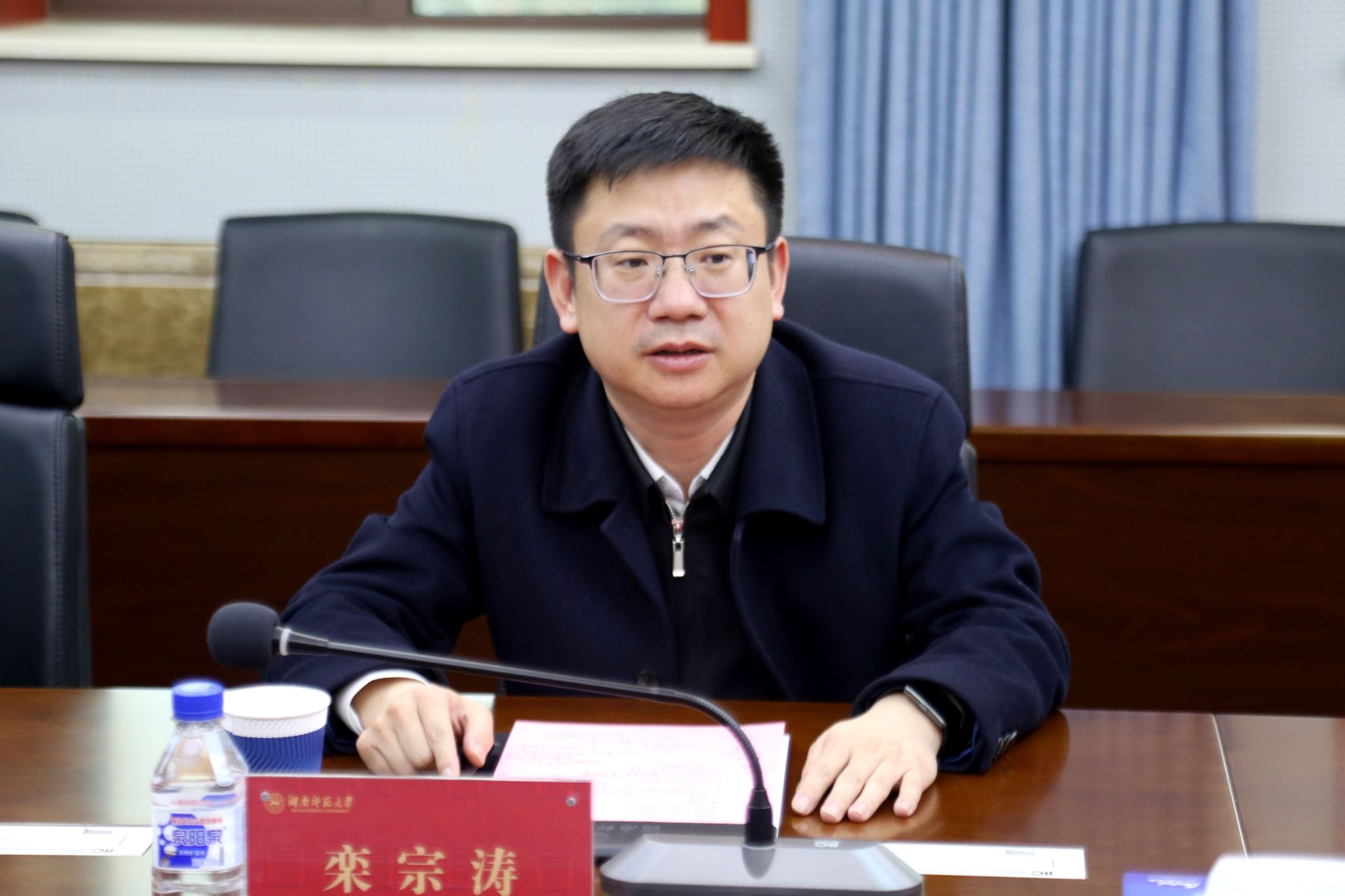蔣洪新對欒宗濤副司長一行的到來表示熱烈歡迎,向教育部、省教育廳對我校一直以來的關(guān)注和支持表示感謝。他介紹了我校學(xué)科學(xué)位建設(shè)的發(fā)展歷程、發(fā)展現(xiàn)狀和未來規(guī)劃。他表示,學(xué)校始終肩負(fù)為黨育人、為國育才的光榮使命,堅持把學(xué)位與研究生教育工作擺在重要位置,不斷優(yōu)化學(xué)科布局,注重交叉融合,推動學(xué)科建設(shè)和學(xué)位發(fā)展邁向新階段、取得新成就。他表示,學(xué)校將貫徹落實(shí)相關(guān)要求,以學(xué)位點(diǎn)建設(shè)為牽引,通過卓越的研究生教育來提升拔尖創(chuàng)新人才培養(yǎng)質(zhì)量,促進(jìn)學(xué)校各項(xiàng)事業(yè)高質(zhì)量發(fā)展,為建設(shè)教育強(qiáng)國、教育強(qiáng)省,辦好人民滿意的教育而努力。